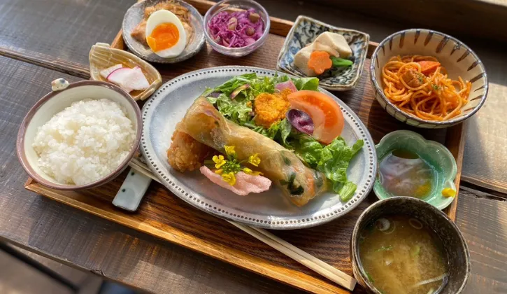 日替わりでお野菜、お米は新鮮な地元産が中心